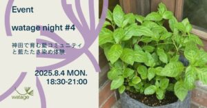 企画趣旨 「watage night」は、鍛冶町二丁目界隈の生活者が集う機会として、地域生活者の馴染みあるテーマを取り上げて開催していくシリーズイベントです。今回のテーマ:神田で育む藍コミュニティと藍たたき染め体験神田に … 続きを読む watage night#4 神田で育む藍コミュティと藍たたき染め体験