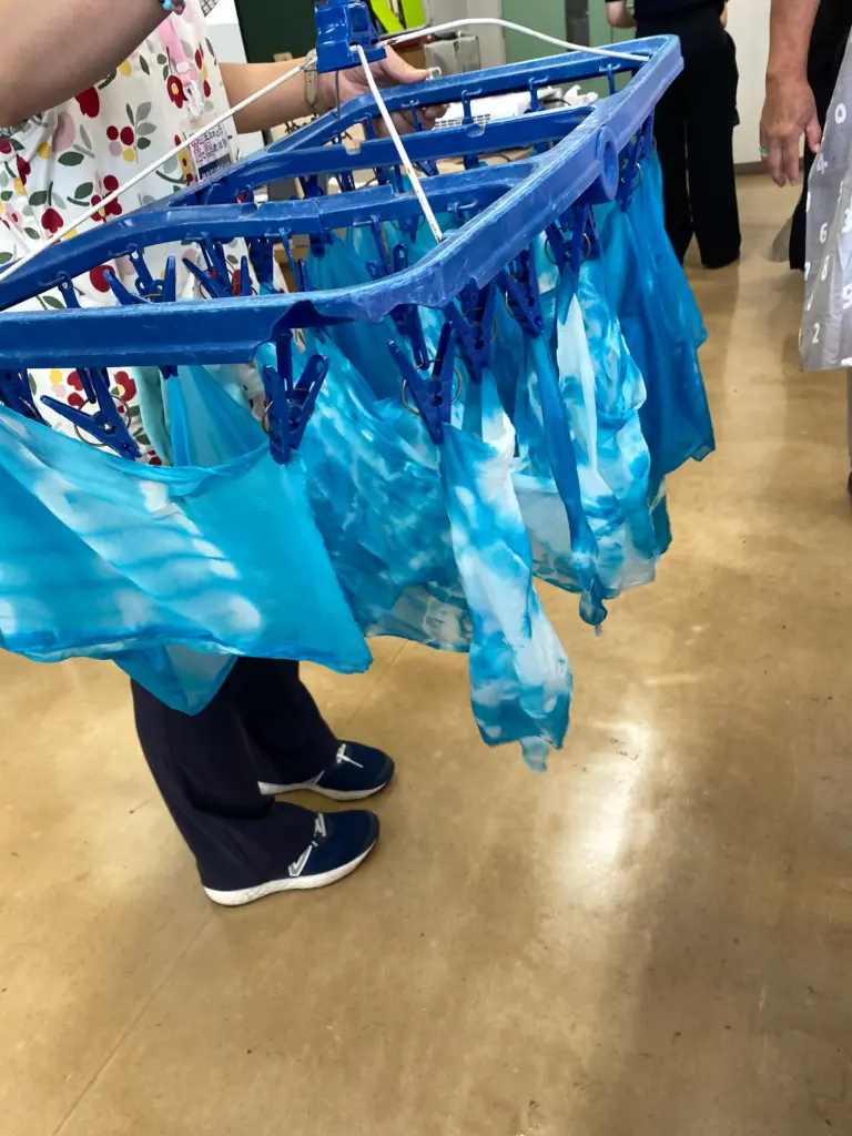 各々に楽しくあれこれ考えながら絞りを入れ、生葉染めを藍の会チームメンバーのサポートにより行いました。