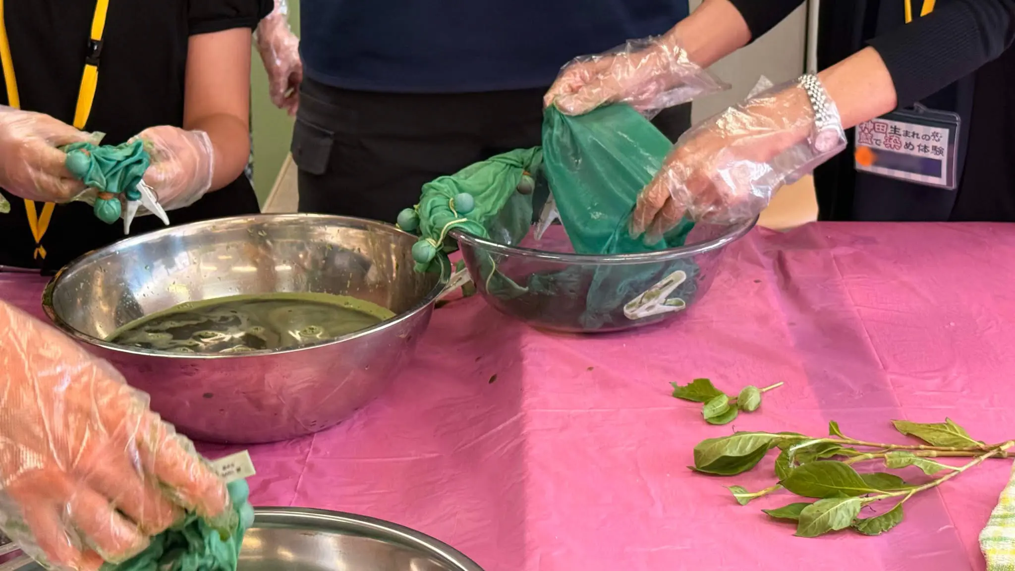 各々に楽しくあれこれ考えながら絞りを入れ、生葉染めを藍の会チームメンバーのサポートにより行いました。