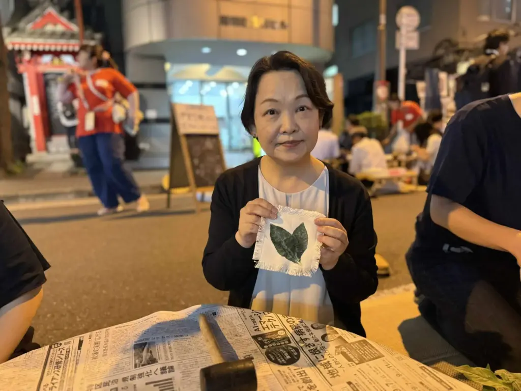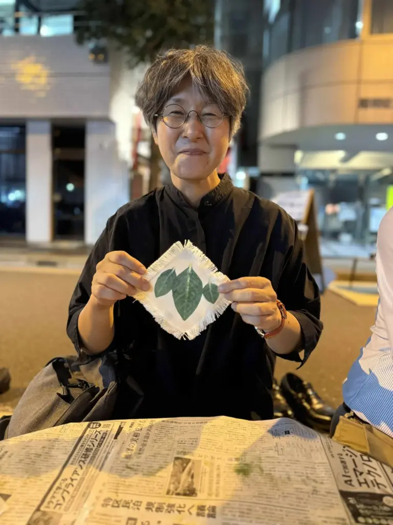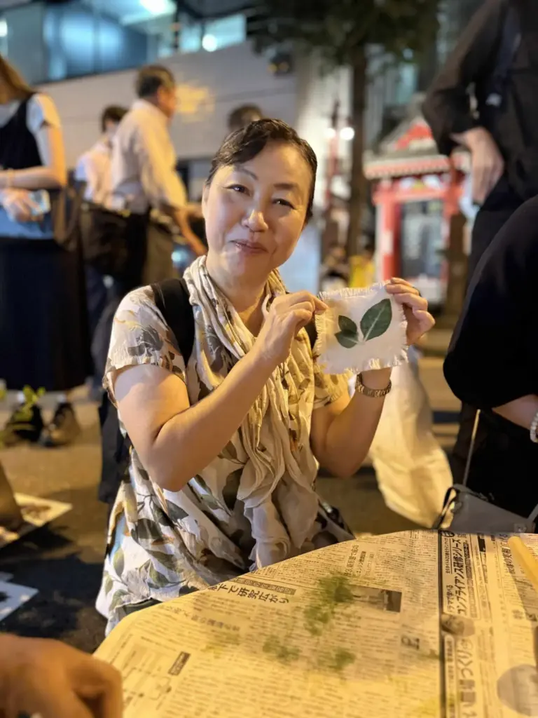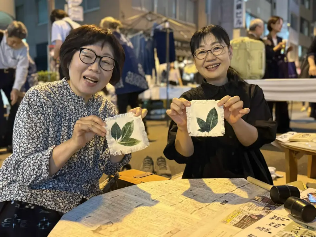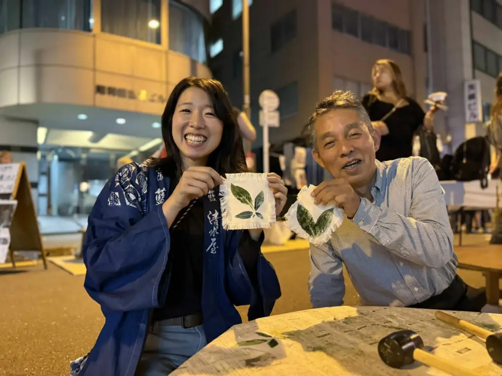 内容はたたき染めでコースターを染めるもので、去年も参加くださった親子連れの方や、たまたま訪れていただいた和紙作家ご夫妻や、神田にお勤めの方など多くの方に、たたき染めを経験していただきました。