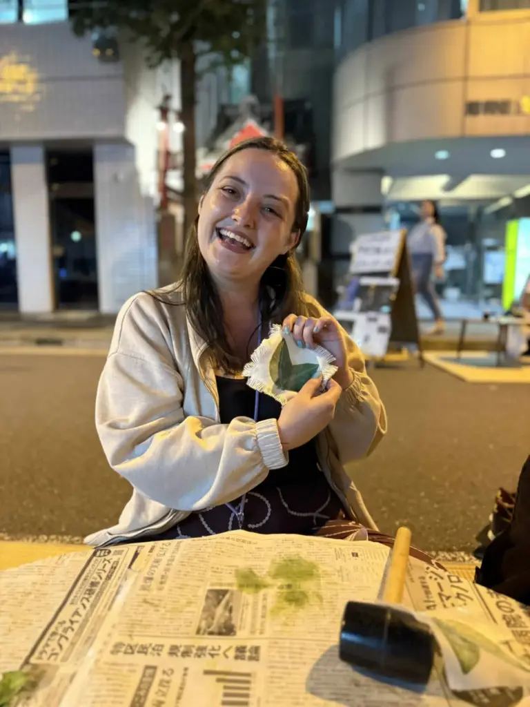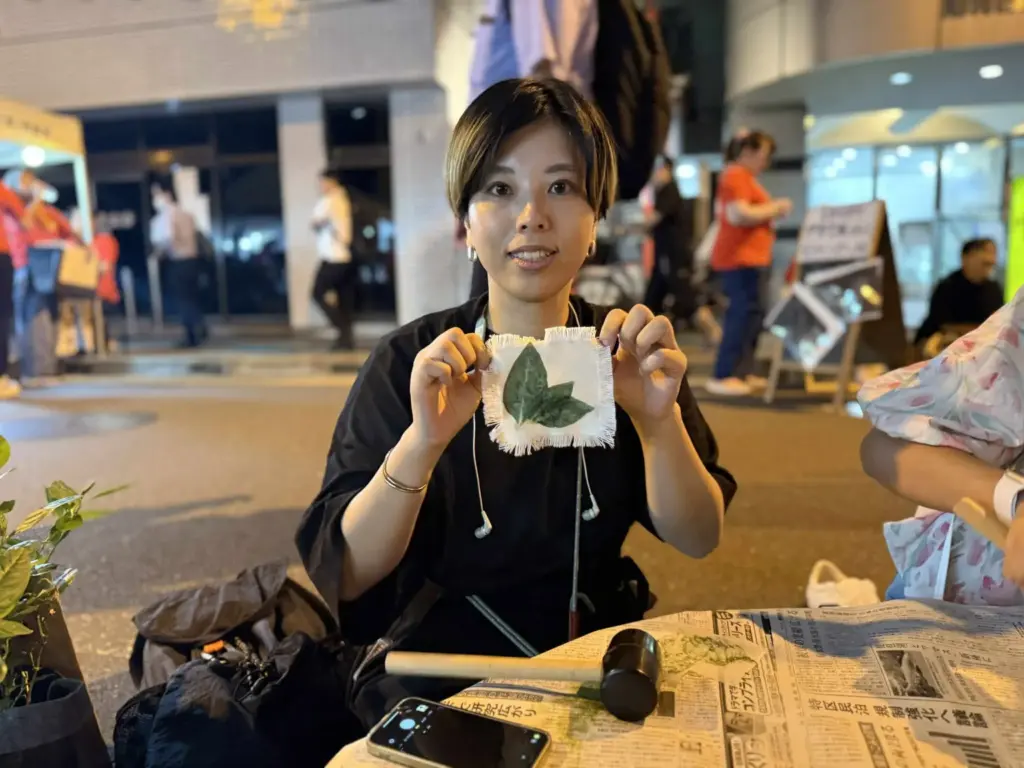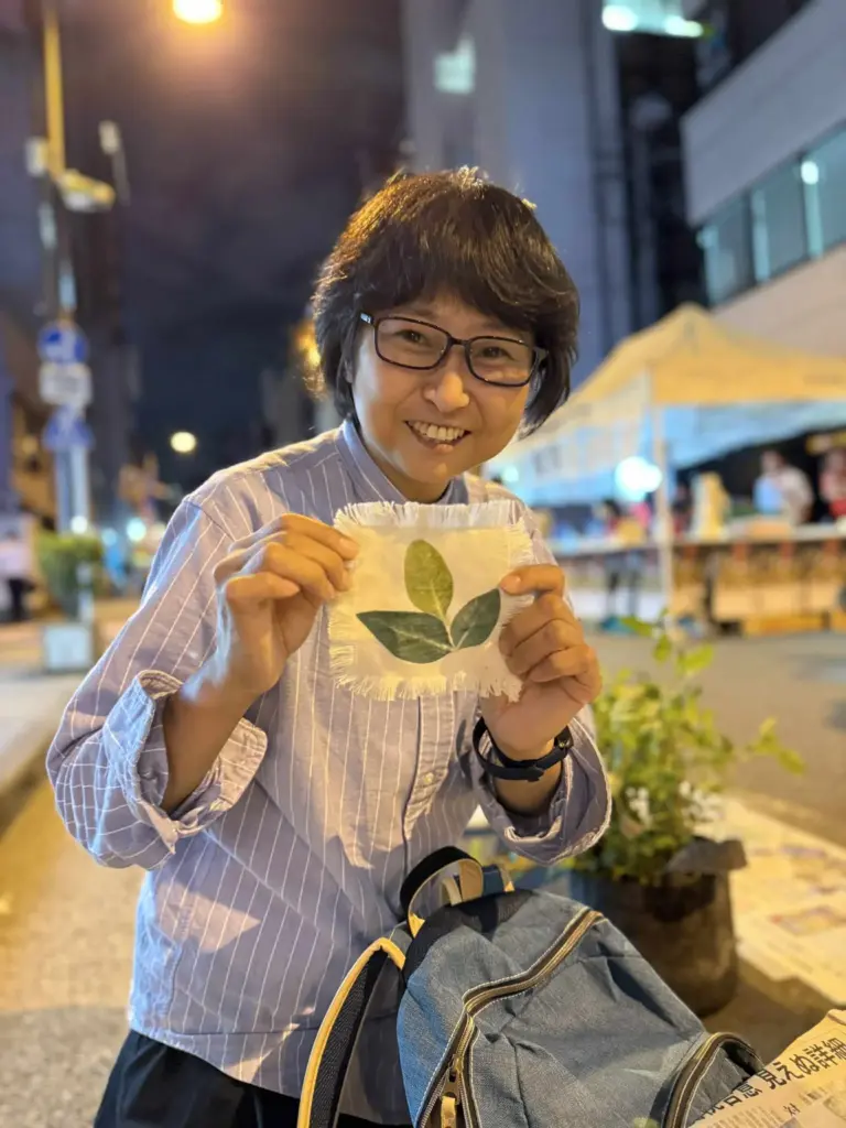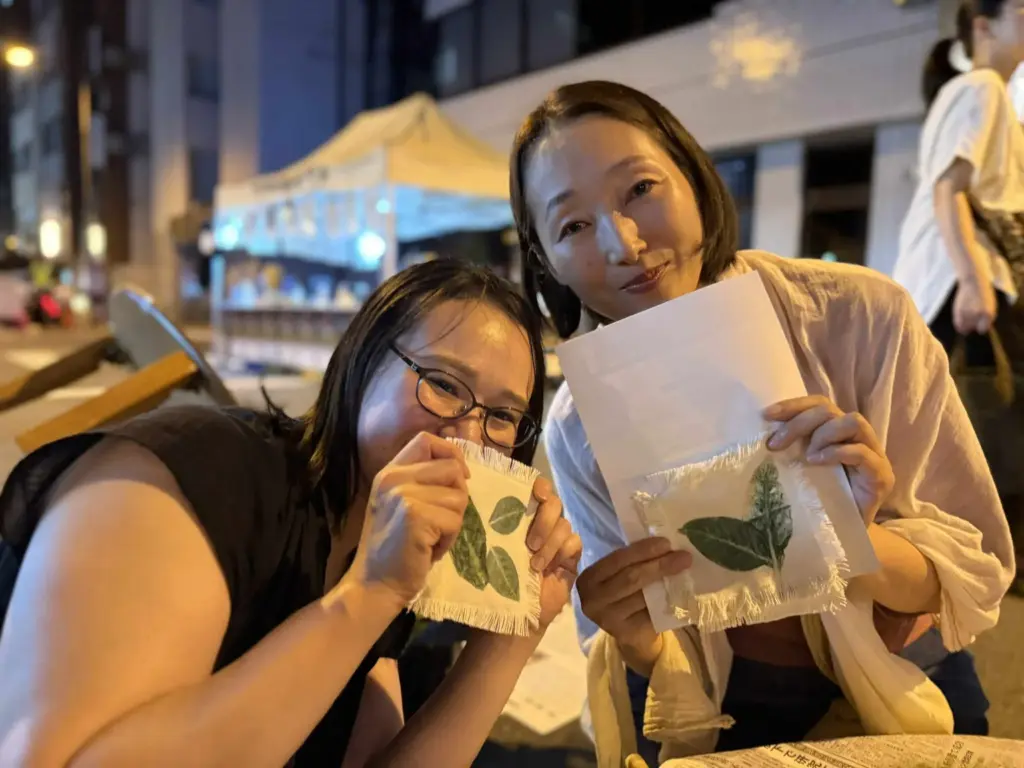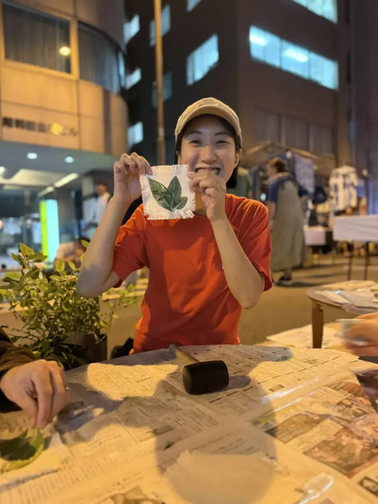内容はたたき染めでコースターを染めるもので、去年も参加くださった親子連れの方や、たまたま訪れていただいた和紙作家ご夫妻や、神田にお勤めの方など多くの方に、たたき染めを経験していただきました。